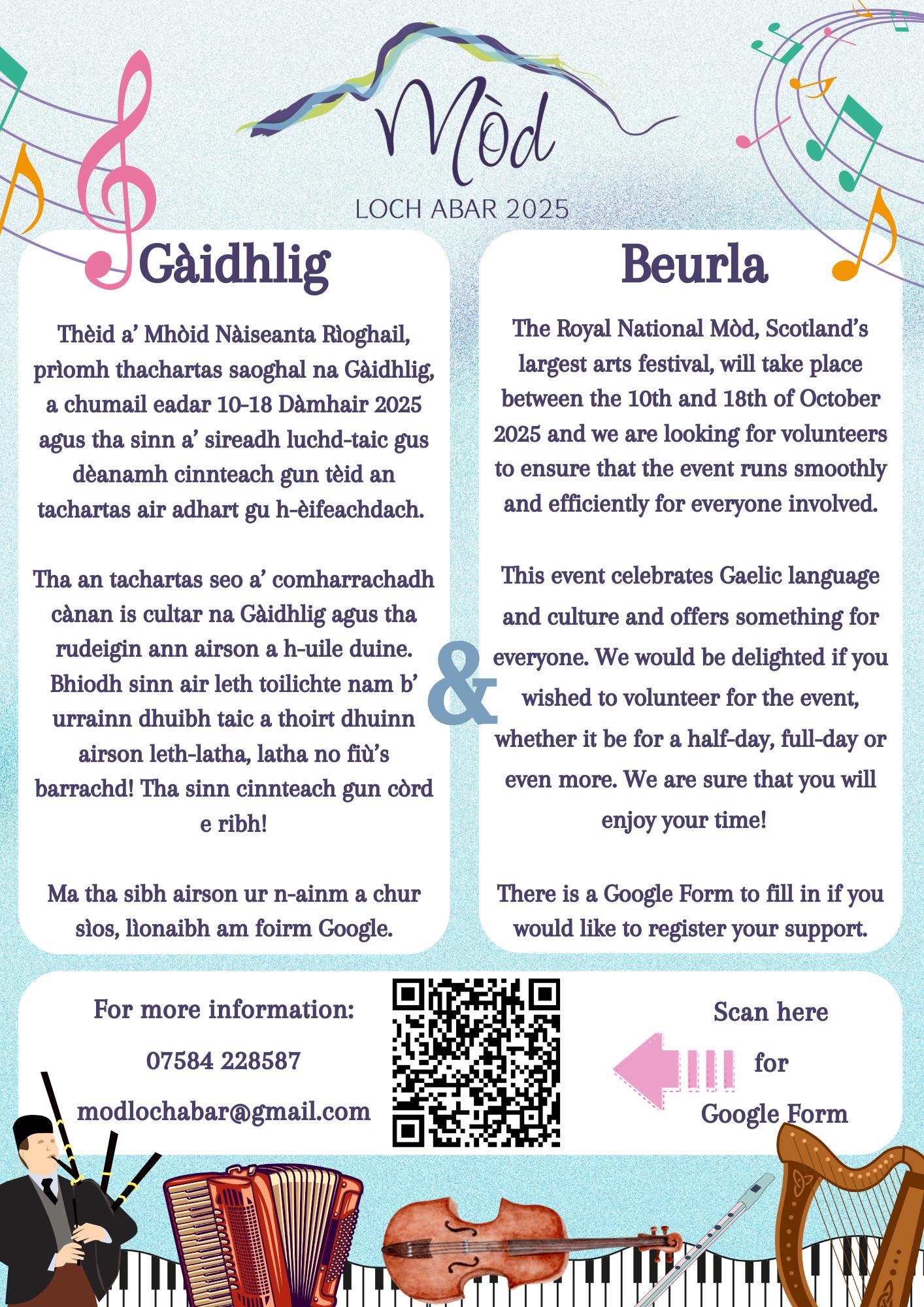 Tha Comataidh Ionadail Loch Abar air a bhith trang ag ullachadh gnothaichean gu h-ionadail airson Mòd na bliadhna seo. Nam biodh sibh deònach uair a thìde no dhà a thoirt dhaibh thairis air seachdain a’ Mhòid, cuiribh fios thuca!